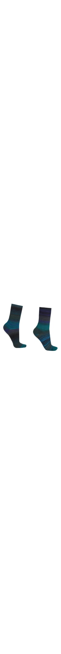 Meia curta feminina confeccionada em lã macia e confortável, caracterizada por um padrão de listras multicoloridas.