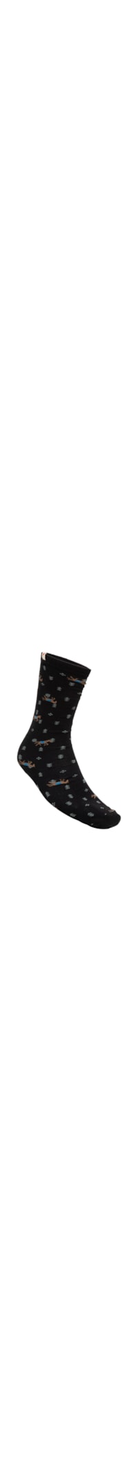 A meia preta é confeccionada em malha de alta elasticidade. A peça possui cano médio com superfície canelada, padronagem figurativa de cavalos em cores contratantes e tag da marca em cor contrastante na parte superior.