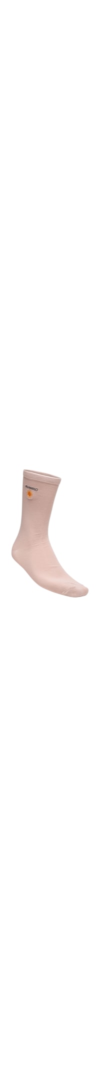 A meia bege é confeccionada em malha de algodão acabamento canelado. A peça possui cano alto e bordado figurativo em cores contrastantes aplicado na parte superior.
