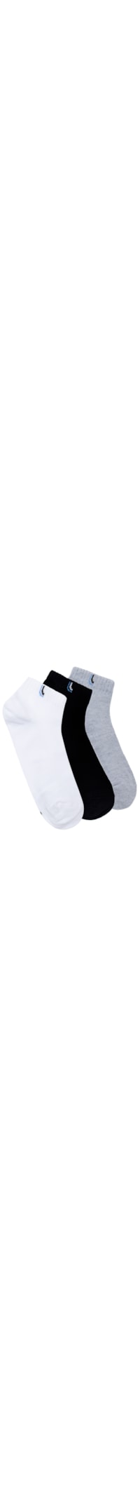 O kit de meias contém três pares nas cores branca, cinza e preta confeccionadas em malha encorpada. As peças possuem cano baixo, detalhamento lateral com logo da marca e acabamento canelado.