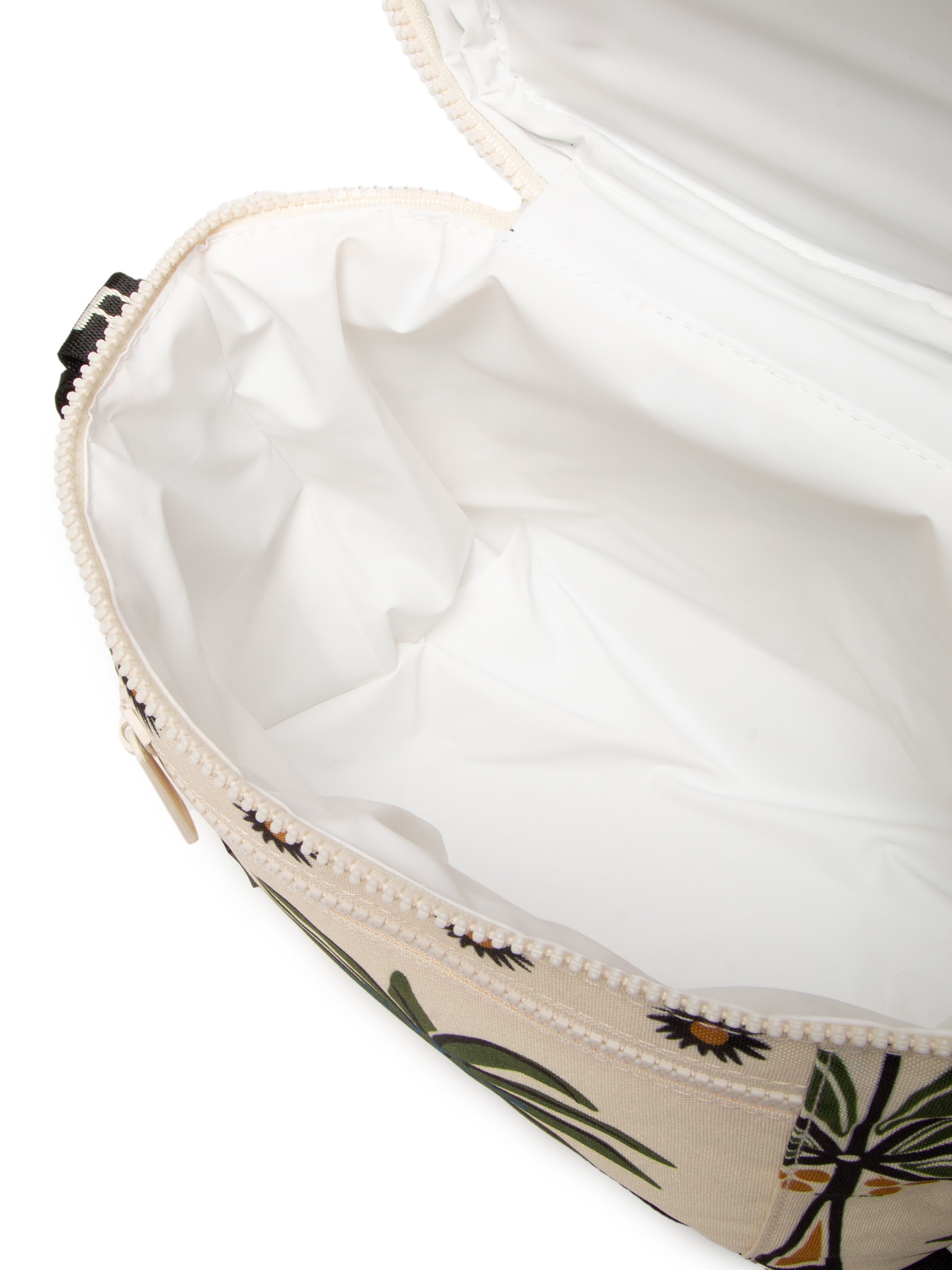 O mini cooler branco é produzido em lona. A peça de tamanho mini, possui formato retangular, compartimento interno amplo com forro em PVC, bolso frontal com fechamento em zíper, mix de estampas em cores contrastantes, alça de mão em gorgurão com nome da marca em baixo-relevo, alça longa regulável em gorgurão com nome da marca em baixo-relevo e com detalhe em mesh acolchoado aplicado para o ombro, base reta e fechamento superior por zíper.