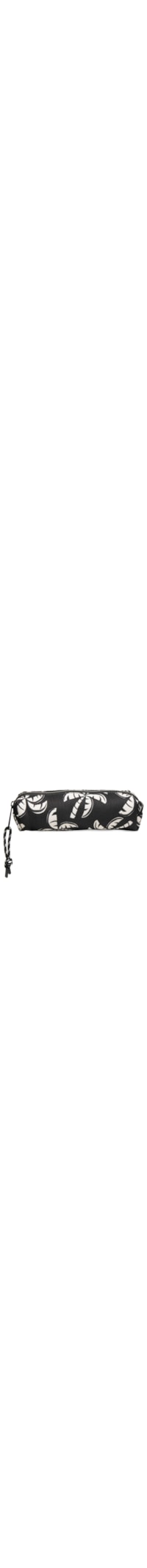 A necessaire preta é produzida em lona. A peça possui tamanho mini, formato retangular, compartimento interno, tag da marca aplicada em borracha na parte lateral, estampa figurativa de coqueiro na cor branca e fechamento superior por zíper com puxador.