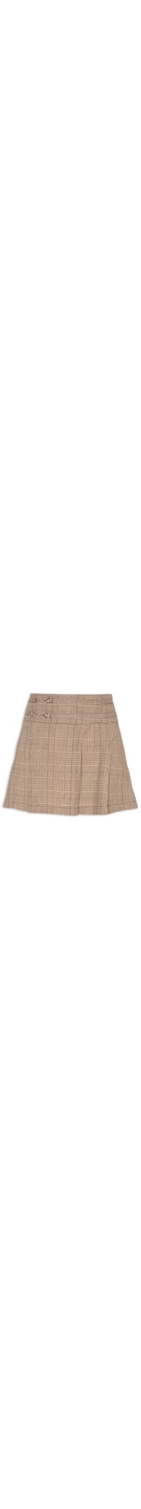 A mini saia marrom é confeccionada em tecido leve sem elasticidade. A peça solta ao corpo possui cintura alta, cós amplo com tiras aplicadas com fivelas metálicas, pregas frontais, padronagem xadrez em cores contrastantes, comprimento curto e fechamento lateral por zíper invisível.