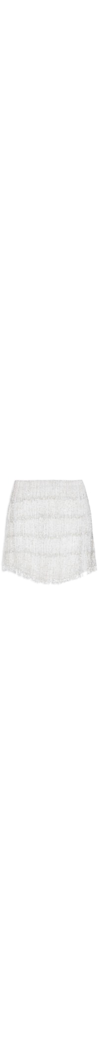 A saia prateada é confeccionada em tecido leve sem elasticidade. A peça justa ao corpo, possui cintura alta, franjas com paetês e miçangas aplicadas em camadas, barra arredondada, comprimento mini, forro e fechamento posterior por zíper invisível e colchete.