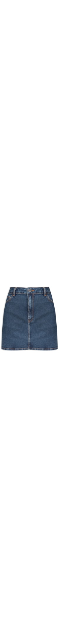 A saia azul é confeccionada em sarja com lavagem jeans sem elasticidade. A peça solta ao corpo, possui cintura alta, cós com passantes aplicados, five pockets* com rebites aplicados, recortes posteriores, logo da marca bordado no bolso posterior, comprimento mini e fechamento frontal por zíper e botão.