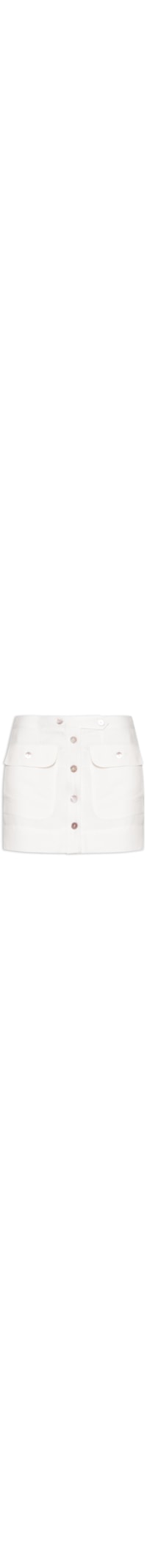 A mini saia branca é confeccionada em tecido leve com toque de linho sem elasticidade. A peça levemente justa ao corpo possui cintura média, cós com transpasse na parte frontal, recortes posteriores e frontais, forro, bolsos frontais modelo cargo, comprimento mini e fechamento frontal por botões.
