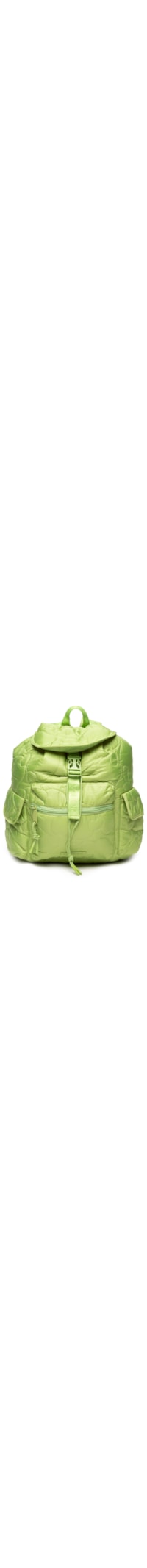 A mochila verde é produzida em tactel com superfície em matelassê. A peça possui tamanho grande, compartimento interno amplo, bolsos laterais em mesh com cordão embutido para regulagem, alça de ombro regulável e removível, alça de mão, alças e sobreposição posterior e frontal em faixa de gorgurão com nome da marca em baixo-relevo, bolso frontal com fechamento por zíper com puxador, tag da marca aplicada em borracha na parte frontal, padronagem abstrata, alças longas e fechamento frontal por fecho engate.