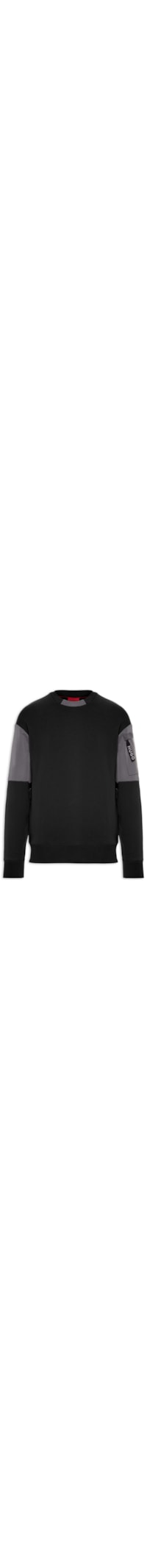 O moletom preto é confeccionado em algodão. A peça possui gola careca com detalhe em cinza, mangas longas com punhos ajustados e partes com tecido quadriculado cinza, no braço esquerdo contém bolso embutido com fechamento de zíper e nome da marca aplicado, ombros levemente estendidos e shape solto