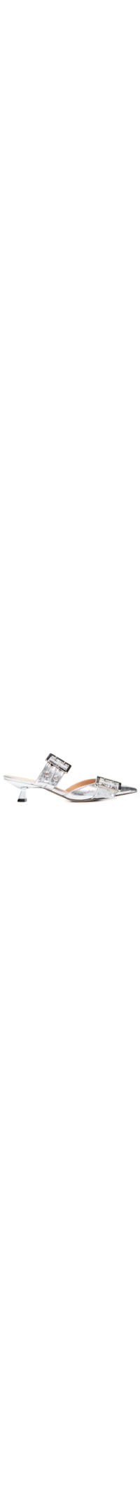 O mule prata é produzido em couro com superfície metalizada. A peça possui bico fino, tiras largas na parte superior com aplicação de ilhóses e fivela metálica, palmilha com o nome da marca em tom metalizado, salto baixo de modelo taça e solado laqueado.