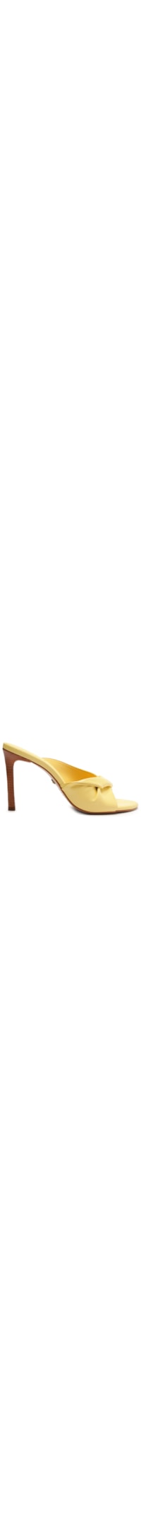 O mule amarelo é produzido em couro. A peça possui bico fino, tira larga com detalhe de transpasse e drapeado, salto alto com detalhe de fachete e solado laqueado.