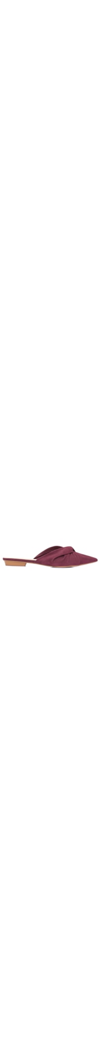 O mule vinho é produzido em camurça. A peça possui bico fino, recorte superior com detalhe de nó, palmilha macia com nome da marca timbrado, salto flato e solado laqueado.