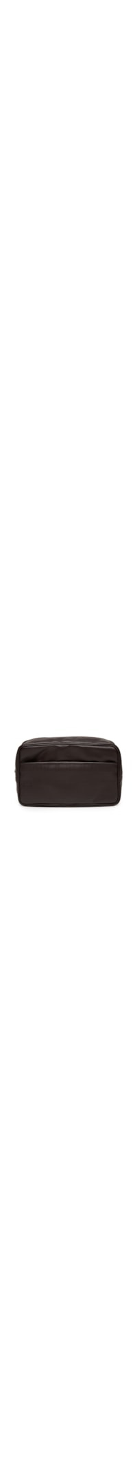 A necessaire marrom é produzida em couro. A peça possui tamanho grande, formato retangular, bolso frontal com fechamento por zíper e puxador, logo da marca em baixo-relevo na parte frontal, padrão em baixo-relevo no bolso frontal e fechamento superior por zíper com puxador.