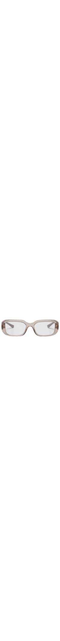 O óculos bege é produzido por nylon. A peça possui formato retangular com laterais arredondas, tamanho S51, armação polida na cor marrom transparente, lentes transparente de demonstração e não polarizada, hastes com espessuras médias, detalhes em frisos e nome da marca aplicado na lateral e encaixe com ajuste para ponte alta