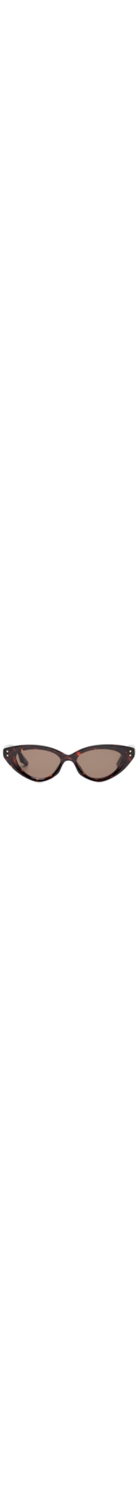 O óculos marrom é produzido em acetato. A peça de modelo gatinho, possui formato arredondado com laterais afuniladas, lentes com proteção UVA/UVB pretas, logo da marca gravado no canto da lente direita, efeito tartaruga, detalhes metálicos frontais e hastes médias com nome da marca gravado.