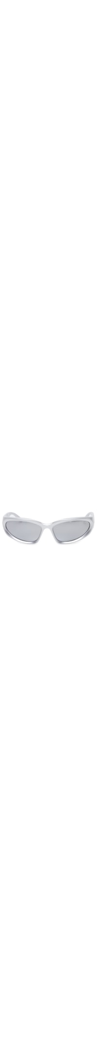 O óculos prata é produzido em acetato com superfície metalizada. A peça possui formato retangular, lentes espelhadas na cor cinza e hastes médias com nome da marca gravado em tom contrastante.