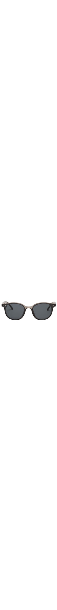 O óculos cinza é produzido em acetato. A peça possui formato arredondado, lentes escuras, detalhes de círculos metalizados na parte frontal, recortes anatômicos, transparência e hastes finas com nome da marca aplicado em baixo-relevo na cor branca.