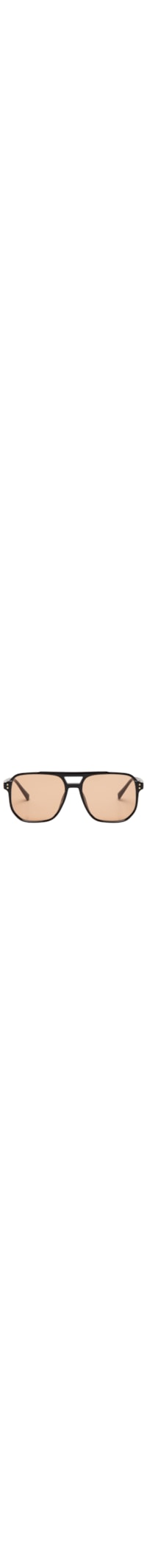 O óculos preto é produzido em acetato. A peça possui formato quadrado, recorte vazado no centro, lentes escuras na cor bege com detalhes metálicos nas laterais e hastes finas com nome da marca aplicado em baixo-relevo na cor branca.