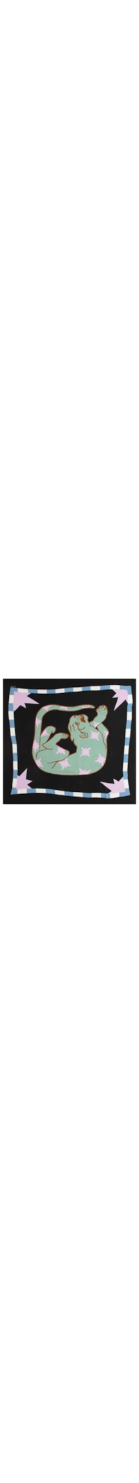 O lenço preto é confeccionado em tecido leve sem elasticidade. A peça possui formato quadrado, mix de estampas em cores contrastantes, nome da marca aplicado na parte superior em cor contrastante e leve transparência.