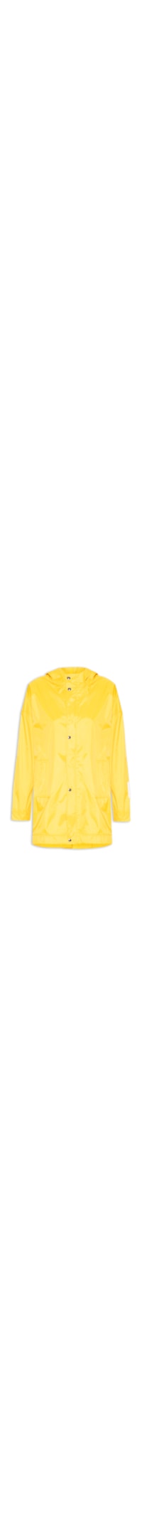 A parka amarela é confeccionada em nylon sem elasticidade. A peça solta ao corpo possui capuz com tira alongada embutida para ajuste e amarração, ombros estendidos, mangas longas com tag de identificação aplicada próximo ao punho em tom contrastante, bolsos embutidos na parte frontal, ilhóses respiráveis aplicados nas laterais frontais e posteriores, fenda posterior, comprimento alongado e fechamento frontal em zíper e vista sobreposta com botões de pressão