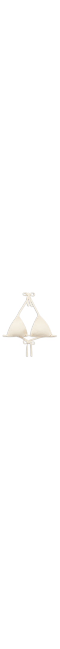 Parte de cima de biquíni em formato triângulo cortininha, com copas removíveis e sem aro, para um efeito natural. O destaque fica por conta do tecido crinkle com efeito tridimensional. As alças possuem uma abertura em anel nas extremidades, possibilitando que sejam inseridas na alça inferior de amarrar nas costas ou atadas na nuca. Fecho posterior com tira fina.