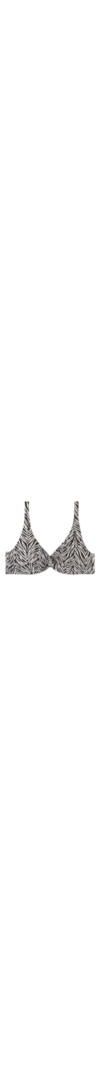Parte de cima de biquíni balconette sem bojo e com aro, destacando-se pelo elegante nó central. A estrutura das copas e o corte lateral amplo oferecem bom apoio para seios maiores. A copa é revestida internamente com tecido de tule para garantir maior suporte. O modelo apresenta uma estampa de zebra em preto e branco. Alças reguláveis e removíveis, permitindo cruzá-las nas costas ou ajustá-las na nuca. Fecho posterior com gancho e dupla regulagem para melhor ajuste ao redor do tórax.