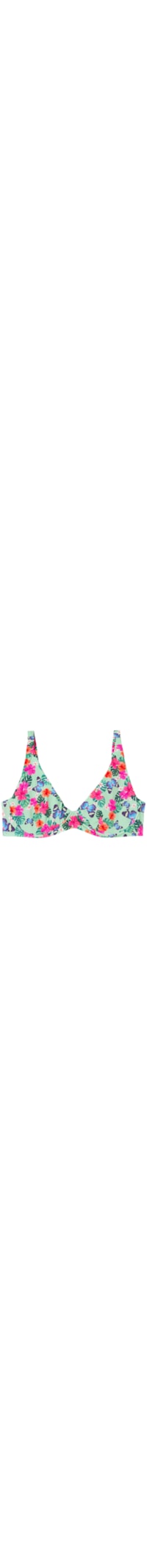 Parte de cima de biquíni estilo balconette, sem enchimento, com aro e alças largas. O centro do peito é alto, proporcionando excelente ajuste, mesmo para seios maiores. Possui um padrão tropical em tons vibrantes e é forrada com um tecido de cor contrastante. As alças têm um ilhó na ponta que permite amarrá-las nas costas ou fazer um laço na parte de trás do pescoço. O fechamento traseiro é feito com um laço.