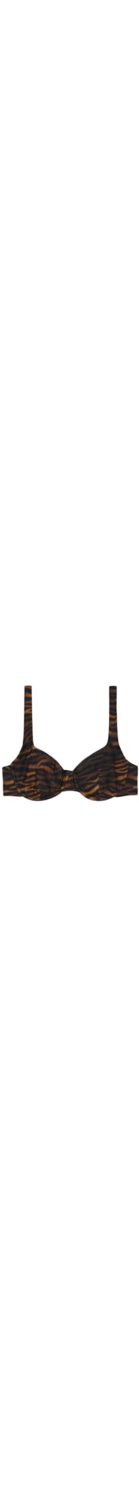 Parte de cima de biquíni balconette não almofadada, ideal para seios generosos. A linha do decote realça o busto. Destaque para o tecido com padrão de tigre em tons escuros. Possui alças reguláveis e fecho posterior com laço fino, adornado por extremidades douradas.