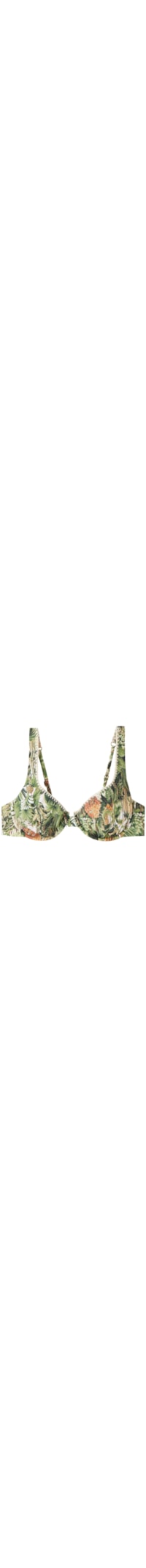 Parte de cima de biquíni balconette com copas levemente almofadadas, reforço alto no centro do busto e aro, oferecendo excelente suporte, mesmo para seios maiores. Confeccionado em tecido macio com um refinado estampado jungle e bordado elegante no decote. As alças são ajustáveis, e o fecho posterior é feito com uma tira fina de amarrar, com pontas coloridas em latão como detalhe.