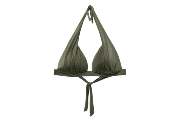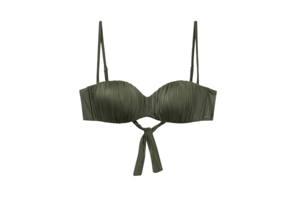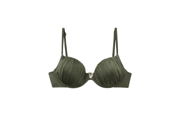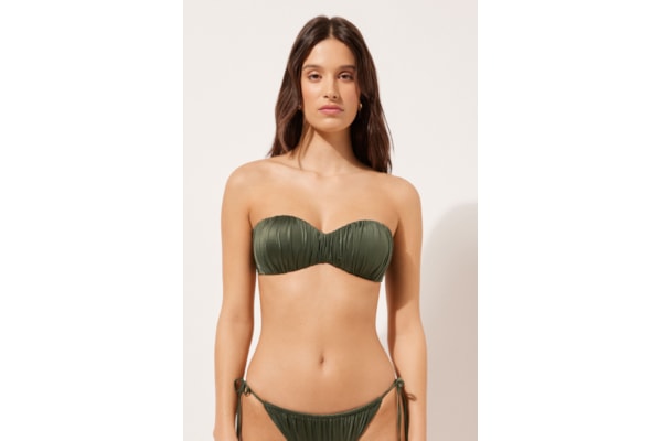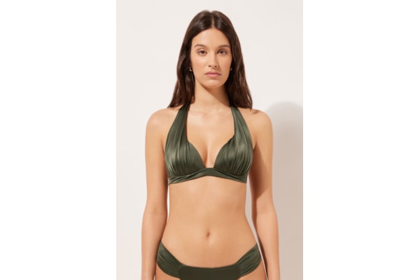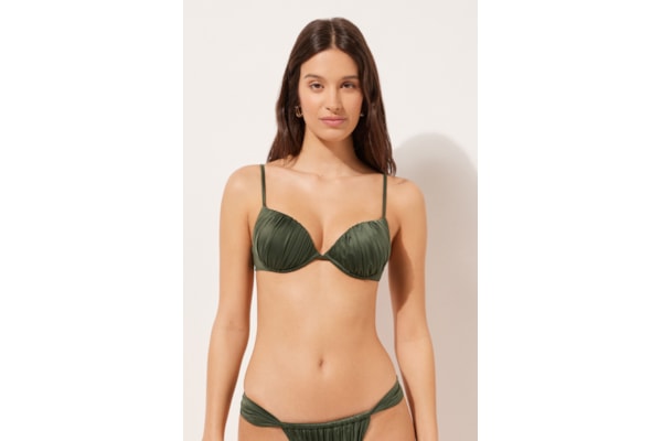 Parte de cima de biquíni balconette sem bojo e com aro para um ajuste perfeito. As taças abraçam e sustentam o busto, com a opção de ajuste através do cordão lateral. Ideal para seios fartos, possui um design elegante com tecido brilhante de efeito seda, detalhes franzidos e ponteiras douradas. As alças são ajustáveis e o fecho possui colchetes de regulagem dupla para maior conforto.