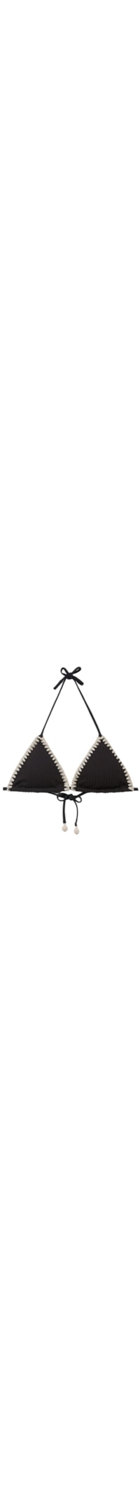 Parte de cima de biquíni cortininha deslizante, sem aro, com copas removíveis para um efeito natural. Confeccionada em tecido franzido, é adornada por um bordado em cor contrastante. As alças possuem uma abertura em anel na extremidade, permitindo inseri-las na faixa inferior para amarração nas costas ou atar na nuca. Fechamento posterior com laços finos.
