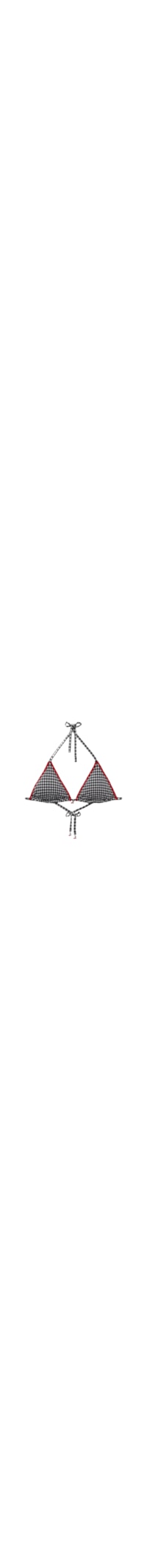 Parte de cima de biquíni cortininha com bojo removível e sem aro, para um efeito natural. Enriquecida com um elegante acessório de cereja no centro do busto, a peça é confeccionada em tecido com estampa vichy e acabamento em delicada passamanaria vermelha, que adiciona um toque sofisticado ao design. As alças com ponta em formato de presilha podem ser presas nas costas ou amarradas na nuca para um ajuste personalizado. Amarração posterior com laço fino para um caimento perfeito.