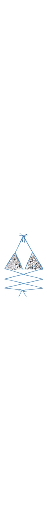 Parte de cima de biquíni em formato de triângulo cortininha dupla face, sem bojo e sem aro. Caracteriza-se por uma estampa animal em tom azul-jeans e pelas tiras finas e compridas que contornam o tórax e prendem na parte de trás.