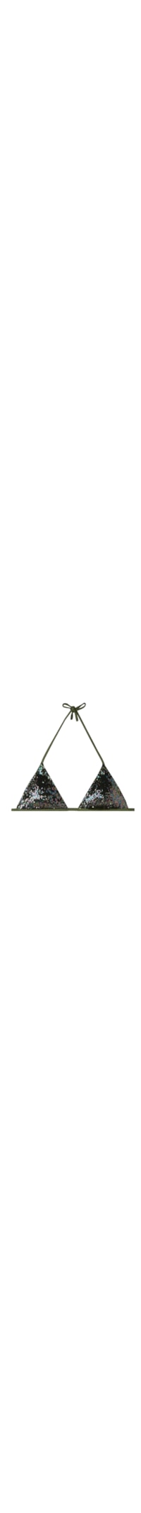 Parte de cima de biquíni em formato de triângulo cortininha com copas removíveis e sem aro para um efeito natural. O tecido de microfibra brilhante é adornado com elegantes lantejoulas. As alças possuem ilhós nas extremidades para que possam ser engatadas na faixa traseira ou amarradas ao redor do pescoço. Amarração fina na parte de trás.