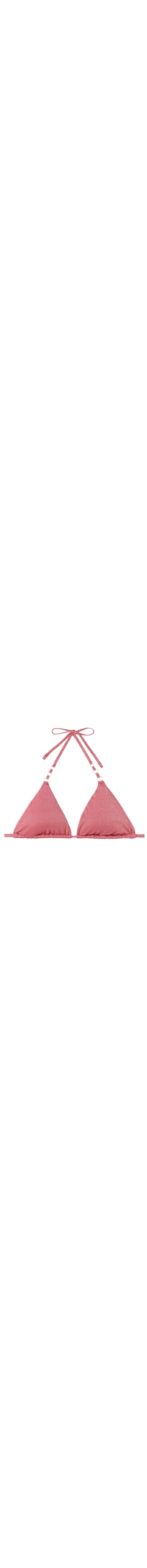 Selecione o tamanhoParte de cima de biquíni triangular sem aro e com enchimento removível. Tecido macio adornado com fio lamê brilhante e argolas douradas sem níquel. As alças possuem ilhós nas extremidades para serem engatadas na faixa traseira ou amarradas ao redor do pescoço. Amarração fina nas costas.