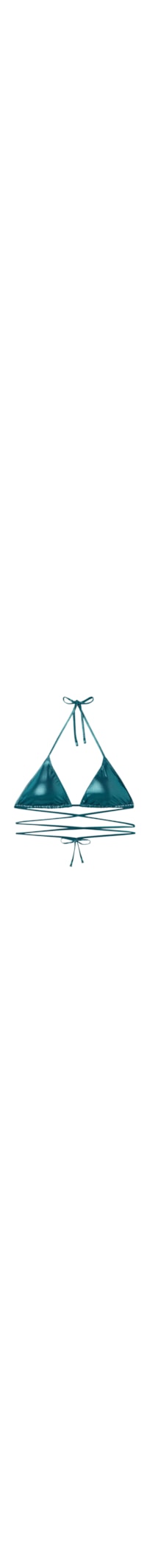 Parte de cima de biquíni em forma de triângulo cortininha, com enchimento removível e sem aro, proporcionando um efeito natural. Confeccionada em um tecido ultrabilhante com efeito metalizado, apresenta tiras compridas cruzadas no tronco, adicionando um toque moderno ao design. As alças possuem uma abertura em anel na extremidade, permitindo que sejam inseridas na alça inferior de apertar nas costas ou amarradas na nuca. O aperto posterior é feito com um laço fino, garantindo um ajuste confortável.