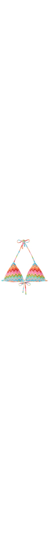 Parte de cima de biquíni em formato triângulo deslizante, com enchimento removível e sem aro, oferecendo um efeito natural. O design é destacado pelo padrão rainbow colorido e strass brilhante que adorna toda a peça. As alças possuem um anel na extremidade, permitindo ajustá-las atrás ou amarrá-las na nuca. O fecho posterior é feito com um delicado laço fino.