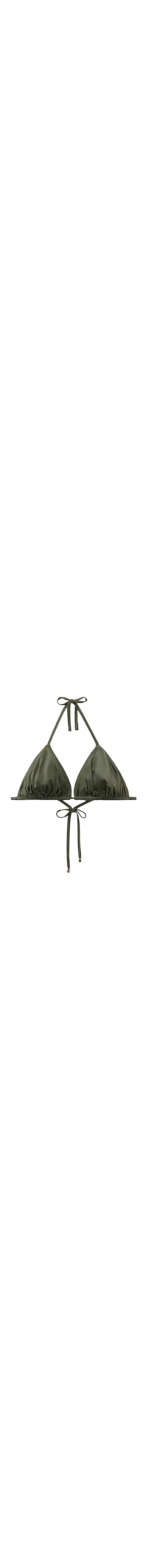 Parte de cima de biquíni triângulo cortininha sem aro e com bojos removíveis. O estilo é caracterizado por um tecido brilhante com efeito seda, adornado com detalhes franzidos e ponteiras douradas. As alças com abertura nas pontas podem ser inseridas nas tiras das costas ou amarradas atrás da nuca. Fechamento nas costas com amarração por tiras finas.