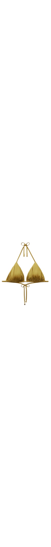 Parte de cima de biquíni triângulo cortininha sem aro e com bojos removíveis. O estilo é caracterizado por um tecido brilhante com efeito seda, adornado com detalhes franzidos e ponteiras douradas. As alças com abertura nas pontas podem ser inseridas nas tiras das costas ou amarradas atrás da nuca. Fechamento nas costas com amarração por tiras finas.