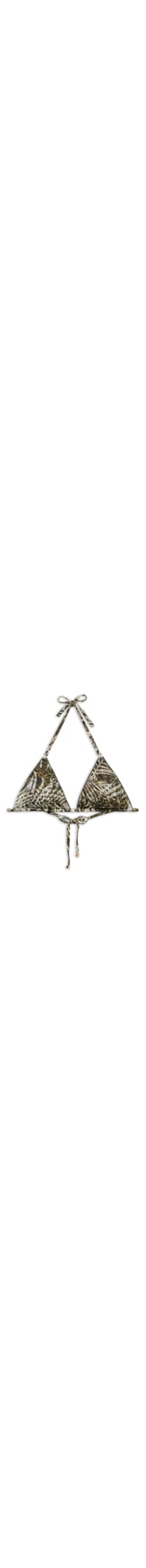 Parte de cima de biquíni em formato cortininha com bojo removível e sem aro, para um efeito natural. A estampa combina folhagens tropicais com elementos que remetem ao animal print, criando um visual moderno e cheio de personalidade. As alças contam com detalhe em argola na extremidade e podem ser amarradas no pescoço ou inseridas na alça inferior para amarração nas costas. Fechamento posterior com laço fino.