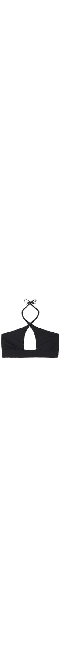 Parte de cima de biquíni estilo faixa, sem bojo e sem aro. Destaca-se pelo cruzamento frontal e pelo tecido tridimensional, especialmente macio, com padrão diagonal. As alças finas amarram atrás da nuca e são adornadas com detalhes prateados nas extremidades. Fechamento posterior com laço.