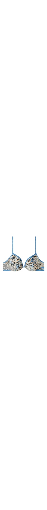 Parte de cima de biquíni push-up com copas com bojo e aro, garantindo apoio e um efeito de volume. Caracteriza-se por uma estampa animal em tom azul-jeans. As alças reguláveis possuem um ilhó na extremidade que permite amarrá-las nas costas ou com um laço na região da nuca.