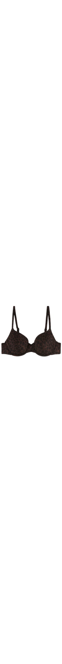 Parte de cima de biquíni push-up, ligeiramente almofadada e com aro, que oferece apoio sem aumentar o volume do busto. Destaca-se pelo tecido com padrão animal em tons escuros. Alças fixas e reguláveis. Fechamento com gancho e ajuste duplo.