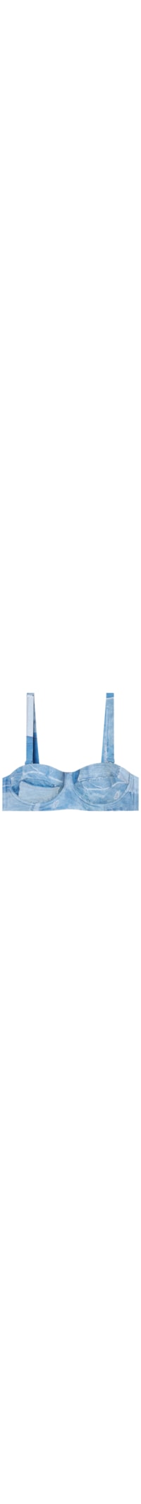 Parte de cima de biquíni estilo tomara-que-caia, estilo corpete com bojo fino, com aro e barras laterais reforçadas garantindo um suporte maior. Caracteriza-se pelo tecido de tule com patchwork em tons de jeans.
