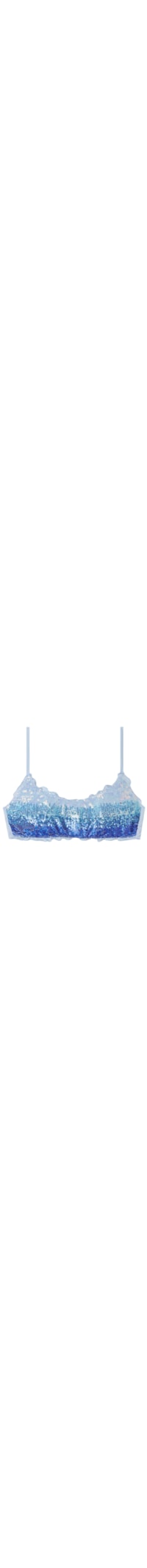 Parte de cima de biquíni estilo top, com aro e com bojo. O modelo é caracterizado por um tecido decorado com paêtes brilhantes e degradê em tons de azul. As barras de reforço laterais oferecem apoio extra ao seio.