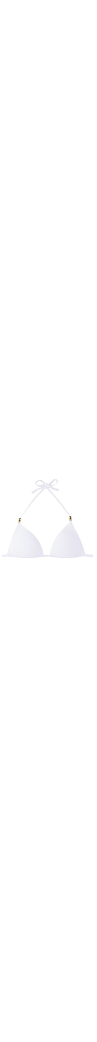 Parte de cima de biquíni em formato de triângulo fixo, sem aro e com copas de bojo graduado para um efeito de volume, realçando a linha do decote. O tecido tridimensional é muito macio, com um efeito chevron e é decorado por berloques dourados em formato de pérola. As alças têm um ilhó na extremidade, permitindo amarrá-las nas costas ou fazer um laço na zona do pescoço. O fechamento ocorre na parte de trás com um laço fino.
