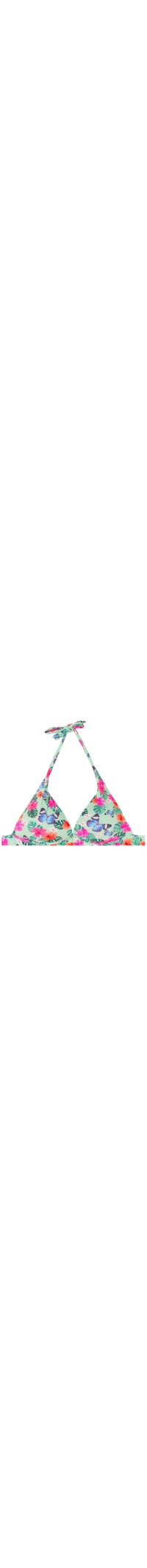 Parte de cima de biquíni estilo triângulo fixo, sem aro, com copas almofadadas e graduadas para proporcionar um efeito de volume que realça o decote. Apresenta um padrão tropical em tons vibrantes e é forrada com um tecido de cor contrastante. As alças têm um ilhó na ponta, permitindo amarrá-las nas costas ou fazer um laço na parte de trás do pescoço. O fechamento traseiro é feito com um laço.