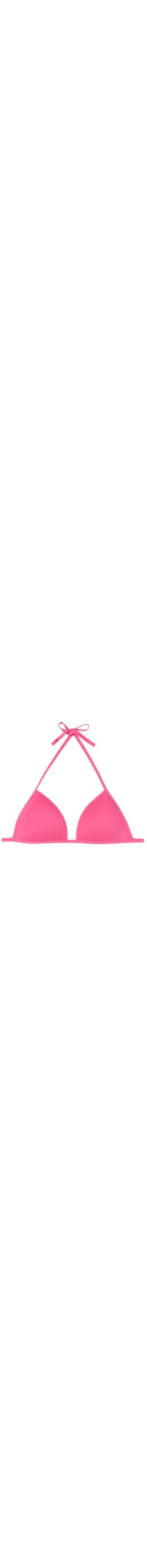 Parte de cima de biquíni em formato de triângulo fixo, com copas de bojo graduado e macio, sem aro. Apresenta um design cruzado no decote para um efeito push-up. Feito de tecido macio e confortável de secagem rápida. As alças têm uma abertura em anel na extremidade, permitindo passá-las pela alça inferior para amarrar nas costas ou atar na nuca. O fechamento na parte de trás é feito com um laço.