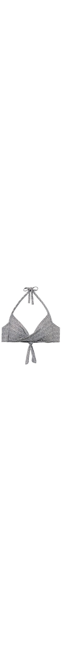 Selecione o tamanhoParte de cima de biquíni triângulo fixo sem aro, com copas almofadadas graduadas para um efeito de volume. Apresenta um padrão em tons de branco e preto adornado por um efeito laminado. As alças possuem uma abertura em anel na extremidade, permitindo inseri-las na alça inferior para amarrar nas costas ou na nuca. Fechamento posterior com laço.