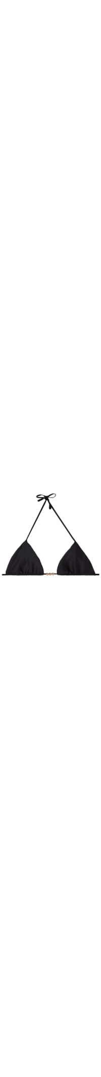 Parte de cima de biquíni em forma de triângulo com bojo muito macio que ajuda a modelar naturalmente o seio. Tecido macio e com relevo com efeito chevron (listras), detalhes com berloques dourados em forma de pérola sem níquel. As alças possuem uma abertura em anel na extremidade, que permite inseri-las na alça inferior de apertar atrás ou atá-las na zona da nuca. Aperto posterior com laço fino.