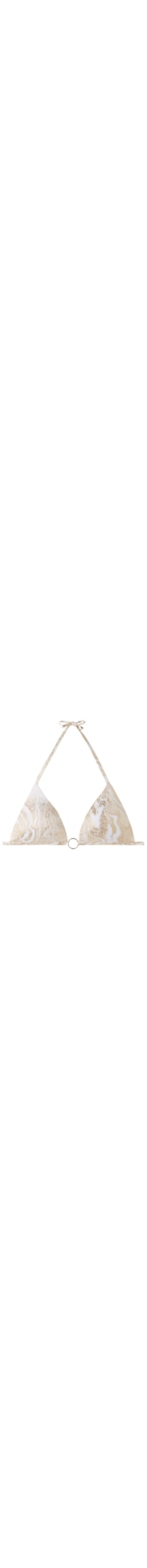 Parte de cima de biquíni em formato de triângulo fixo, sem aro e com bojos almofadados graduados para um efeito de volume que realça a linha do decote. Caracteriza-se pelo tecido macio laminado dourado com estampa de mármore, decorado por uma argola dourada.